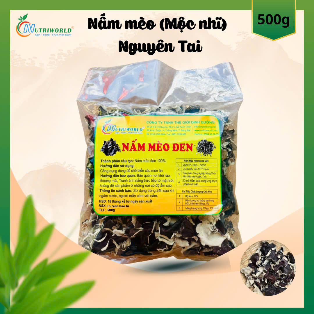 Nấm mèo (mộc nhĩ) Nutriworld nguồn cung cấp sắt, canxi tự nhiên. Bên cạnh đó Nấm mèo có rất nhiều công dụng tốt cho sức khỏe như: Hỗ trợ tim mạch & tuần hoàn máu; Thanh lọc và giải độc cơ thể; Tốt cho tiêu hóa và kiểm soát cân nặng; tăng cường miễn dịch & chống oxy hóa; Hỗ trợ người thiếu máu.