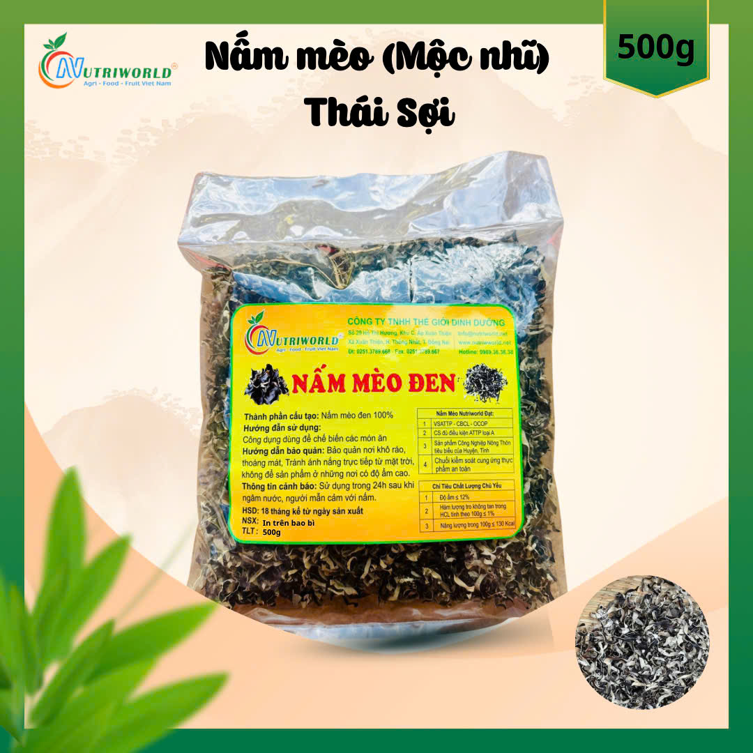 Nấm mèo (mộc nhĩ) Nutriworld nguồn cung cấp sắt, canxi tự nhiên. Bên cạnh đó Nấm mèo có rất nhiều công dụng tốt cho sức khỏe như: Hỗ trợ tim mạch & tuần hoàn máu; Thanh lọc và giải độc cơ thể; Tốt cho tiêu hóa và kiểm soát cân nặng; tăng cường miễn dịch & chống oxy hóa; Hỗ trợ người thiếu máu.
